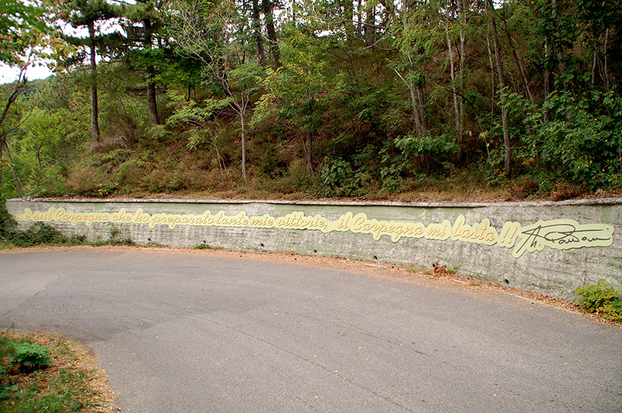 Les senteurs qui nous accompagnent sur cette ascension sont les parfums frais des bois de haute montagne tandis que l’on se lève sur les pédales, avec les nombreuses inscriptions au bord de la route dédiées au Pirate, mais aussi les pentes raides que les grimpeurs apprécient tellement. On admire au sommet un panorama époustouflant de la République de Saint-Marin jusqu’à la mer, mais aussi du Monte Fumaiolo et du Monte Aquilone. Et d’ici il ne nous reste que contempler la gigantographie de Marco avec l’inscription : « ceci est le ciel du Pirate » et penser... est-ce que le Carpegna me suffit ?